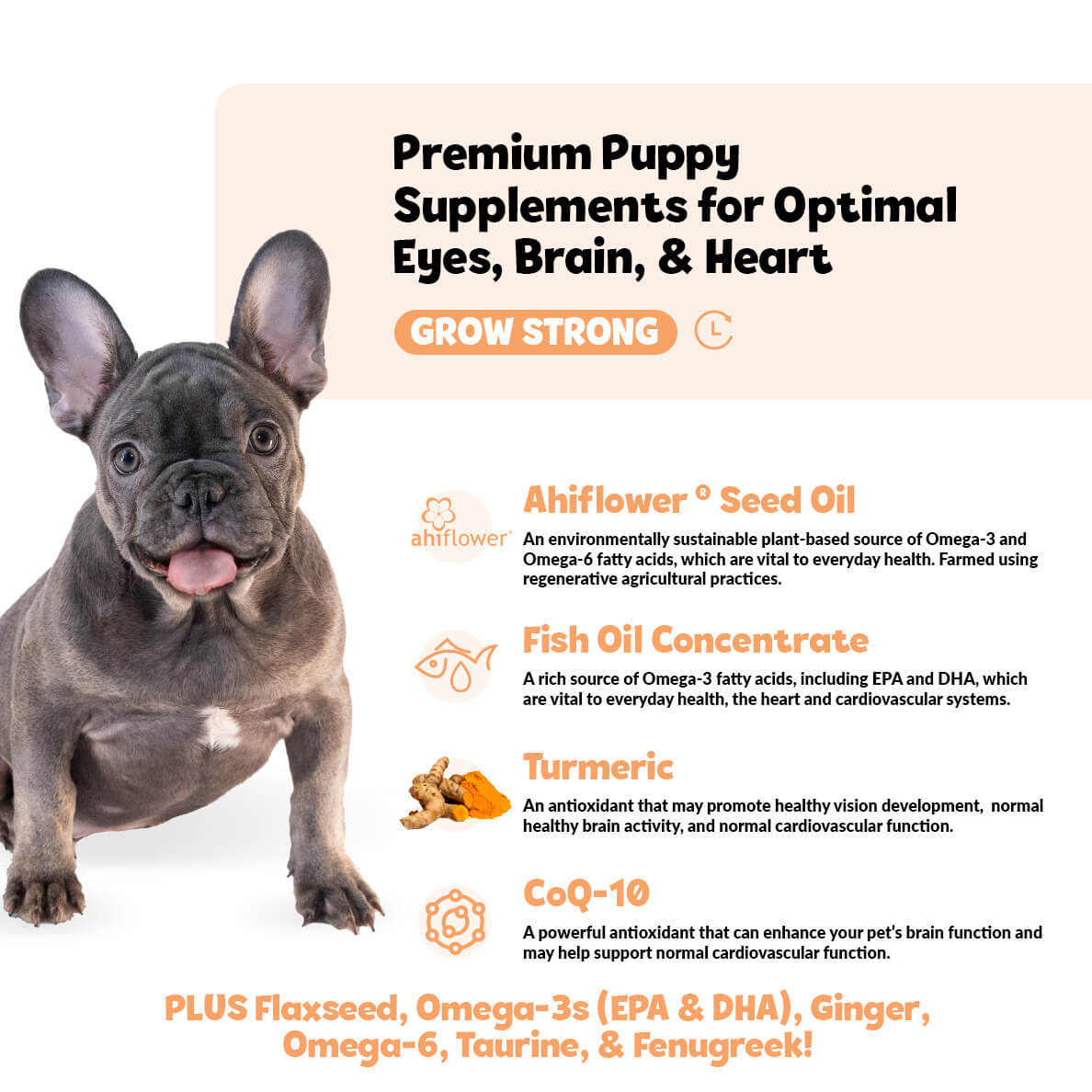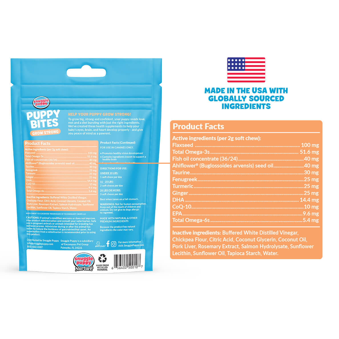 The GrowPro Puppy Bundle includes a 4oz. (60ct.) bag of Grow Strong Supplements for optimal eyes, brain, and heart development and a 4oz. (60ct.) bag of Gut Health Supplements for strong immunity and balanced digestion.Puppy Bites Supplements: