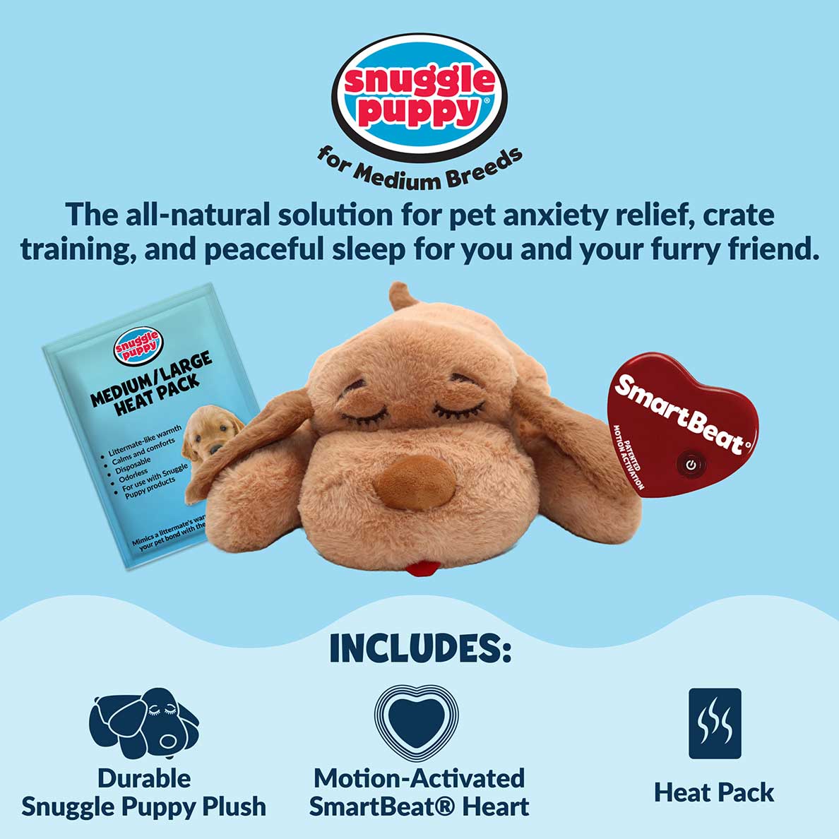 It features a Motion-Activated SmartBeat™ Heart and Overnight Heat Pack. Together, they mimic the warmth and heartbeat of a mom or littermate for natural comfort. This helps reduce stress from separation anxiety, loud noises, and unfamiliar environments.