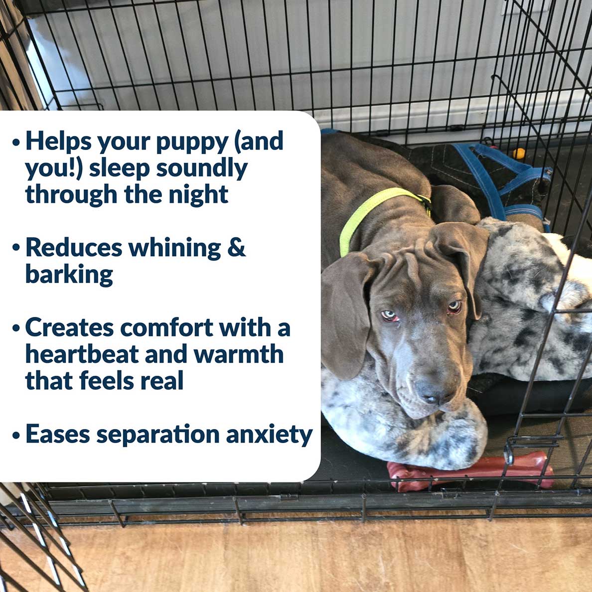 Reduces whining and barking by recreating maternal intimacy with physical warmth and a pulsing heartbeat.