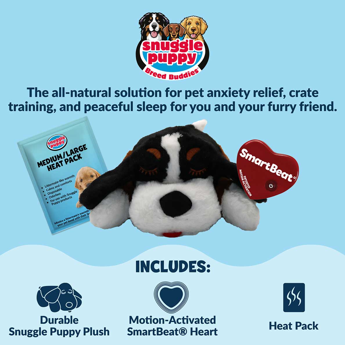 Snuggle Puppy® Breed Buddies™ combine the proven anxiety relief of the original with the signature markings of your favorite breed. Designed to look like a littermate, this familiar friend helps Bernese puppies feel instantly safe, settle into their new home faster, and sleep soundly.