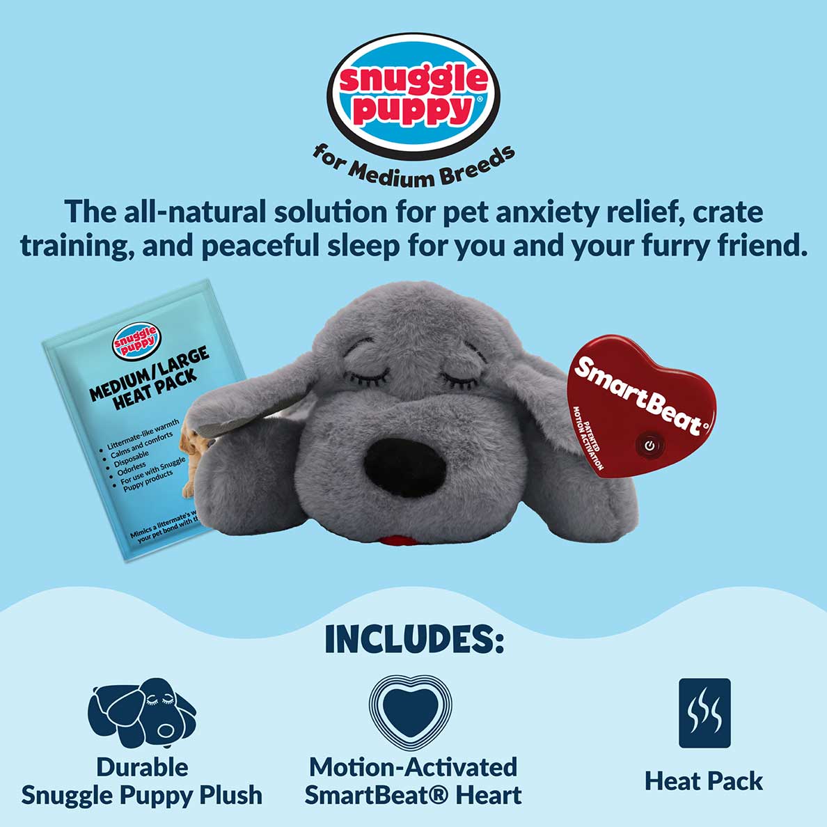 Snuggle Puppy® for Medium Breeds is the perfect solution for pet anxiety relief, crate training, and peaceful sleep for your furry friend. Designed to ease your pet's separation anxiety, it's perfect for new puppies transitioning home or any dog in need of a cozy companion.