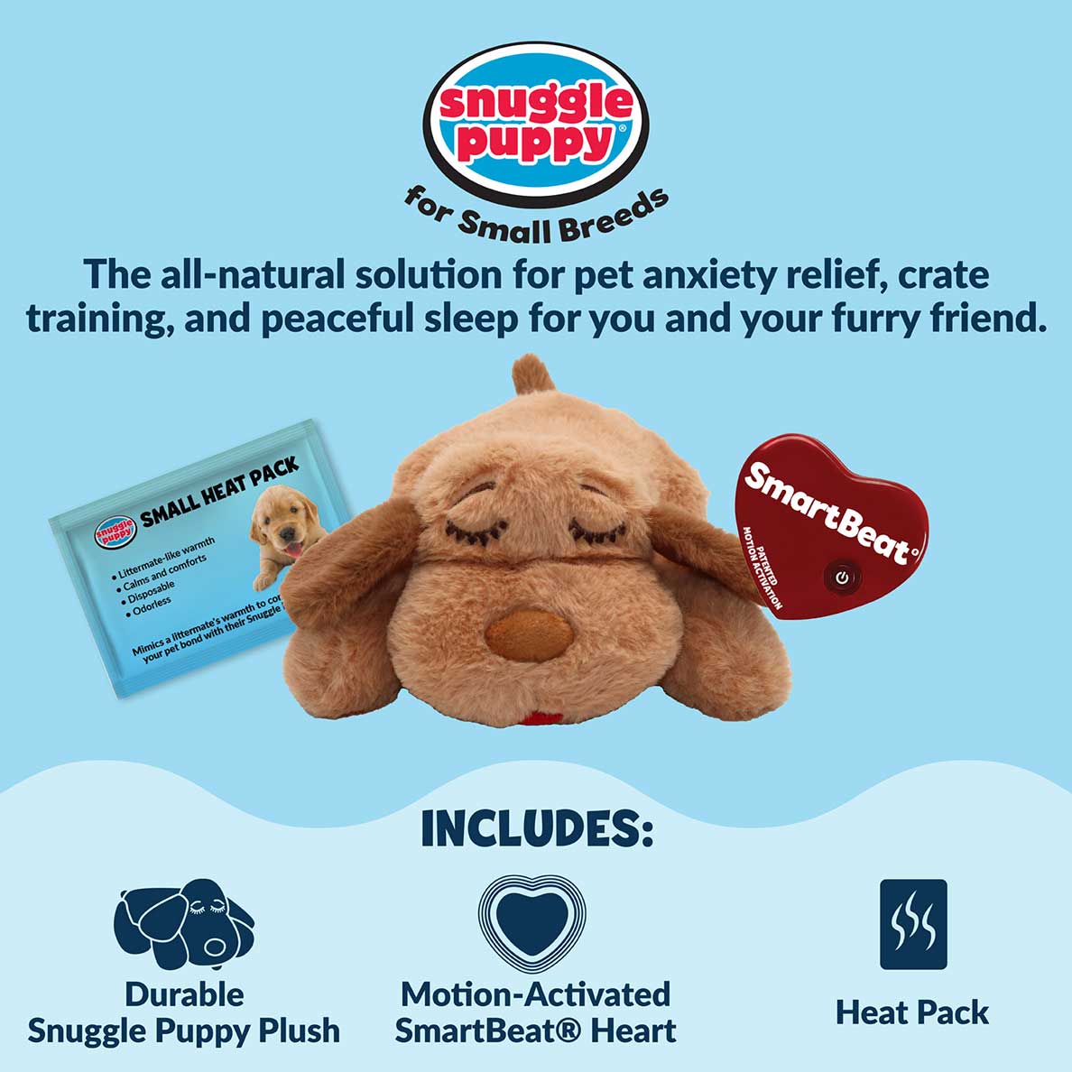 Snuggle Puppy® for Small Breeds is the perfect solution for pet anxiety relief, crate training, and peaceful sleep for your furry friend. Designed to ease your pet's separation anxiety, it's perfect for new puppies transitioning home or any dog in need of a cozy companion.