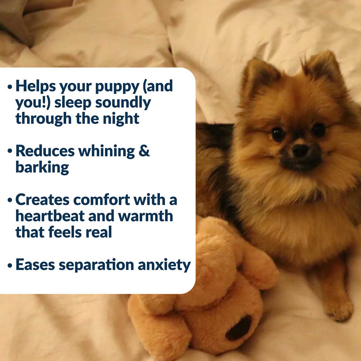 It features a Motion-Activated SmartBeat™ Heart and Overnight Heat Pack. Together, they mimic the warmth and heartbeat of a mom or littermate for natural comfort. This helps reduce stress from separation anxiety, loud noises, and unfamiliar environments.