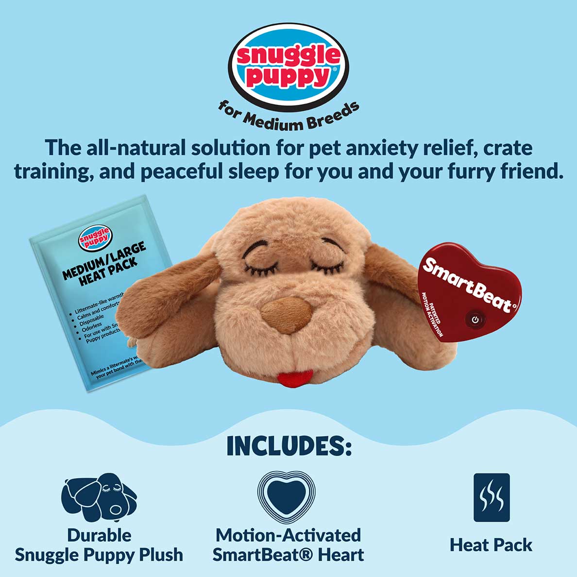 Snuggle Puppy® for Medium Breeds is the perfect solution for pet anxiety relief, crate training, and peaceful sleep for your furry friend. Designed to ease your pet's separation anxiety, it's perfect for new puppies transitioning home or any dog in need of a cozy companion.