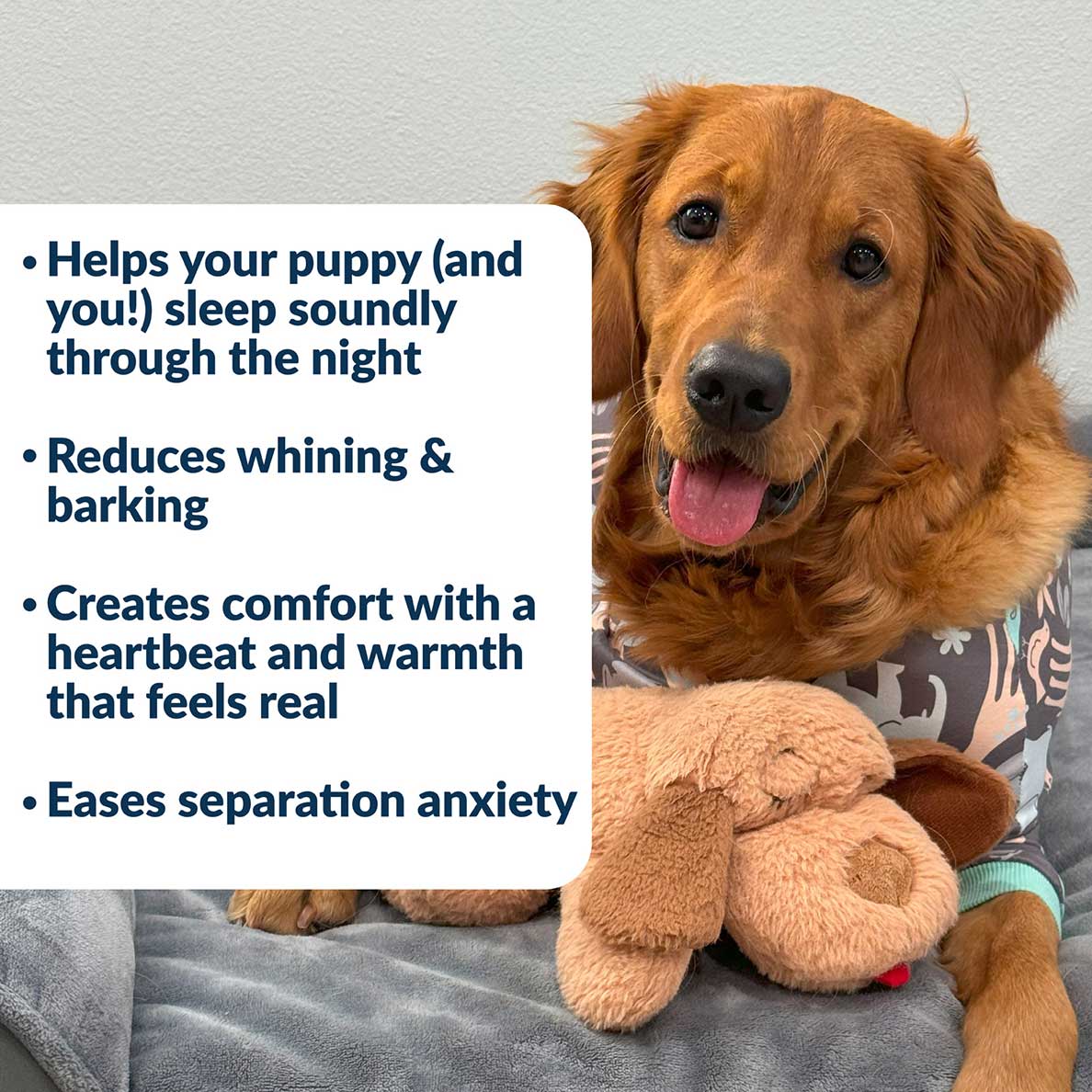 It features a Motion-Activated SmartBeat™ Heart and Overnight Heat Pack. Together, they mimic the warmth and heartbeat of a mom or littermate for natural comfort. This helps reduce stress from separation anxiety, loud noises, and unfamiliar environments.