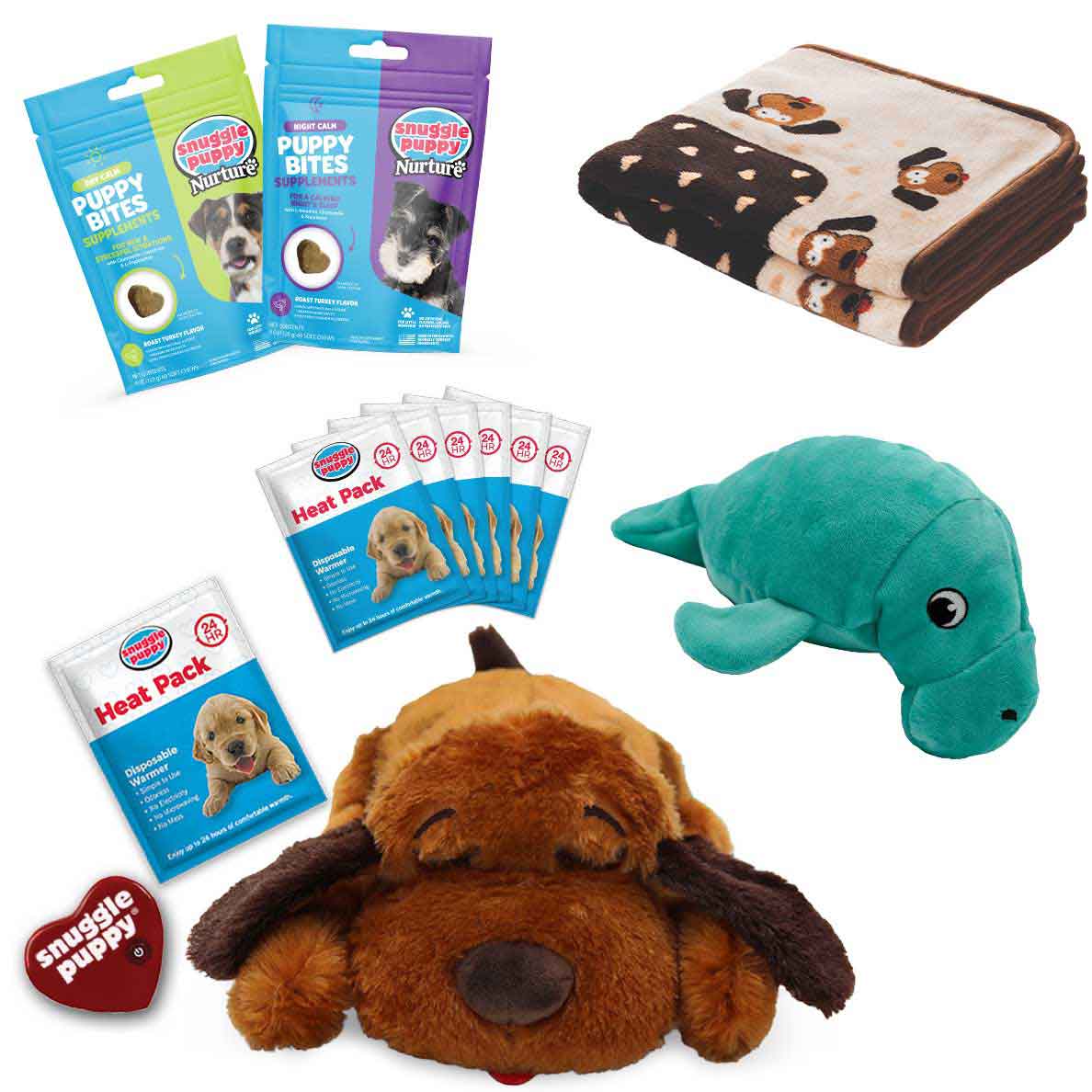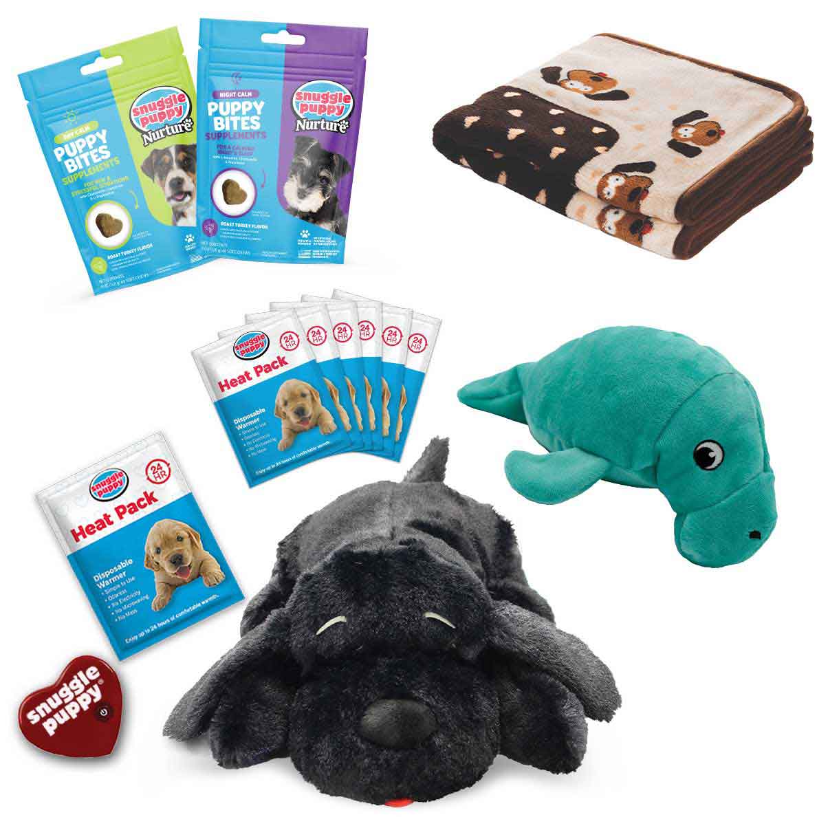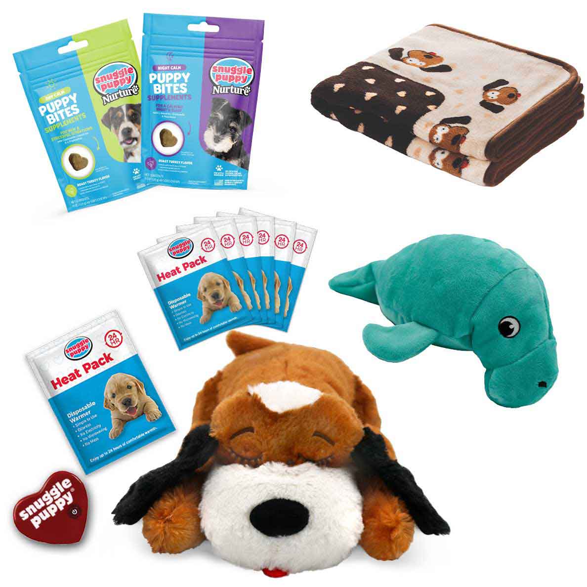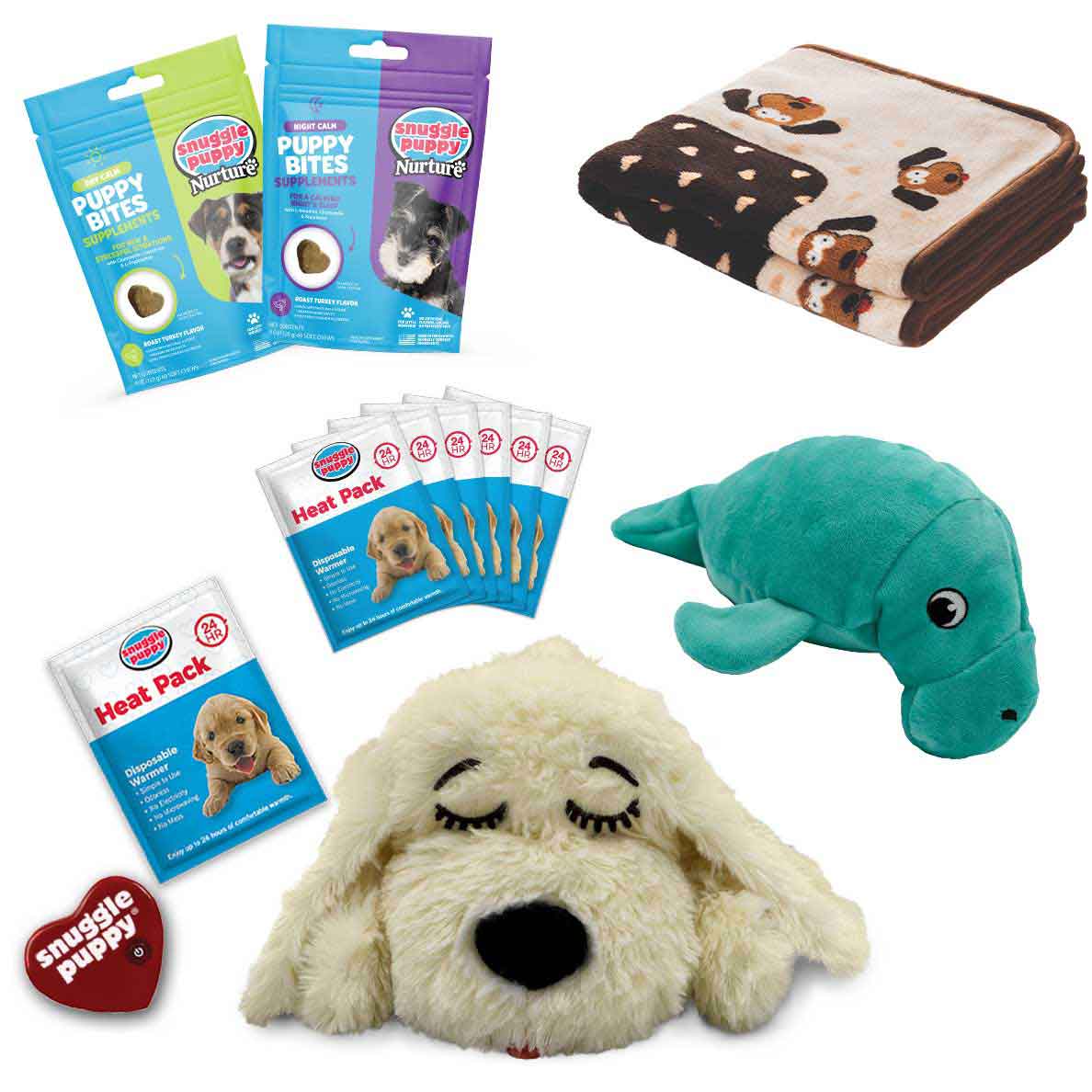 The Original Snuggle Puppy® provides comfort and calmness during crate training and sleep time, making the adjustment easier for you and your pet. With your Snuggle Puppy®, the Ultimate Welcome Home Kit for Big Dogs also includes a cozy 300-gram extra-soft fleece pet blanket, a tear-resistant Tender-Tuffs Honking Manatee® toy, a bag of Day Calm Puppy Bites for new and stressful situations, and a bag of Night Calm Puppy Bites for a calming night's sleep.Snuggle Puppy helps with: