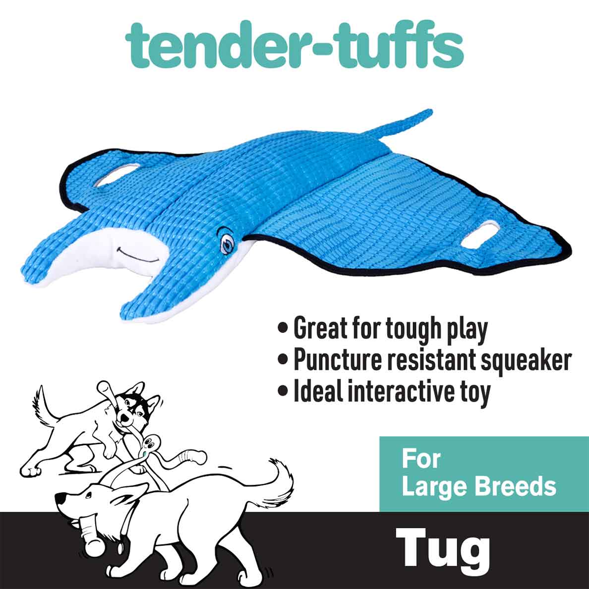 This fun Big Ray dog toy comes with a puncture-resistant squeaker in its body. The body is soft, easy to grip, and perfect for a game of fetch! This pet toy is ideal for large dogs and comes with reinforced TearBlok fabric for hours of play!